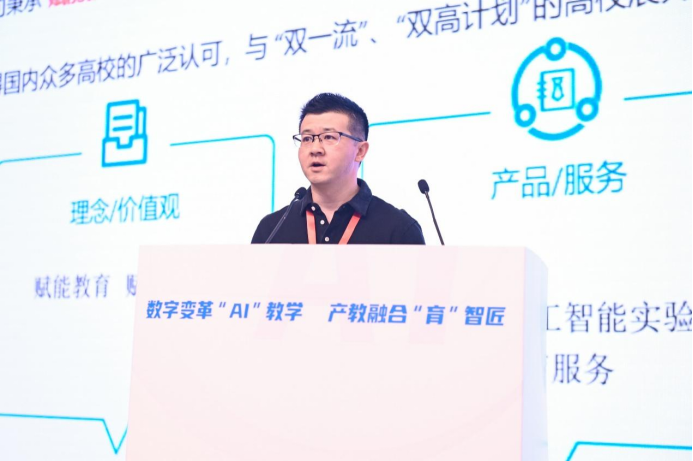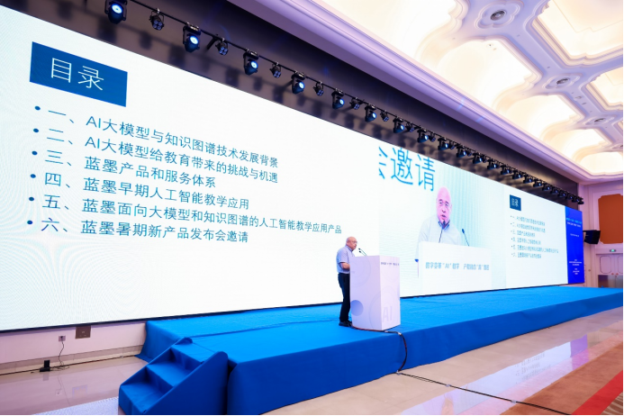 北京智启蓝墨信息技术有限公司董事长靳新围绕“基于大模型和知识图谱技术的教育数字化升级”做了主题报告。他指出,蓝墨作为领先的智能教育云平台,面向中高等院校提供智能云教学平台和数字教材平台两大平台服务,是国内首家推出中高等院校 “人才培养智能一体化服务体系” 的方案提供商。其中智能云教学平台提供从云教学工具、内容、管理、质量监测完整智能云教学平台服务,推动院校实现从“课堂革命”到“质量革命”的提升跨越。数字教材平台为院校提供从数字教材创作工具、数字出版、在线发行、移动学习完整的数字教材平台,实现数字教材的统一规划、统一建设、统一管理、统一应用、统一监测。人才培养智能一体化服务体系建设方案帮助中高等院校构建人才培养全过程、全链条、全场景、数字化、智能化的云服务支撑体系,构建人才培养全过程大数据中心。