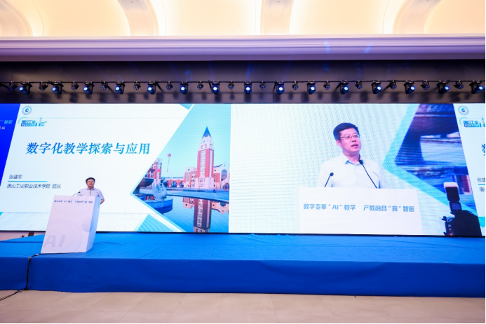 唐山工业职业技术学院校长张建军围绕“数字化教学探索与应用”做了主题报告。他指出,在新一轮科技革命和产业变革背景下,学院充分发挥云智技术对教育高质量发展的放大、叠加、倍增作用,践行“系统设计、需求牵引、应用为王”理念,将数字化思维融入学院发展理念、治理实践与教育教学,以数字化转型升级新成效重塑职业教育的课堂新生态。学院依托智慧教室、数字工厂、智能平台、国家智慧教育平台等智慧教学环境,打破时间、空间、环境限制壁垒,开展基于多维互动教学和数据驱动精准教学,全面实施“线上+线下、教室+基地、虚拟+现实、校内+企业”四融合混合式教学模式,广泛推行覆盖教师授课、学生个性化学习等全场景、跨区域互动教学,实现大数据驱动下的混合式“金课堂”全覆盖,激活教学原动力的师生学习体验感、获得感及数字素养等显著增强。