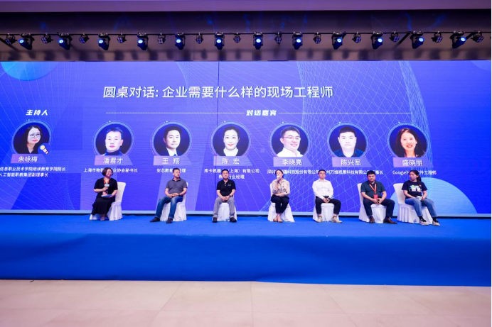 上海电子信息职业技术学院继续教育学院院长、人工智能职教集团副理事长朱咏梅继续主持了圆桌对话环节,圆桌对话主题是“企业需要什么样的现场工程师”。上海市物联网行业协会秘书长潘君才,安芯教育总经理王翔,库卡机器人(上海)有限公司教育行业经理陈宏,深圳市越疆科技股份有限公司李晓亮,广州万维视景科技有限公司董事长陈兴军,Google Nest软件工程师盛晓丽等6位行业企业嘉宾从企业用人、产业发展角度出发,认为现场工程师人才培养要增强综合素质和专业能力培养。论坛各位嘉宾发言的观点都为现场工程师的培养提供了宝贵的经验。